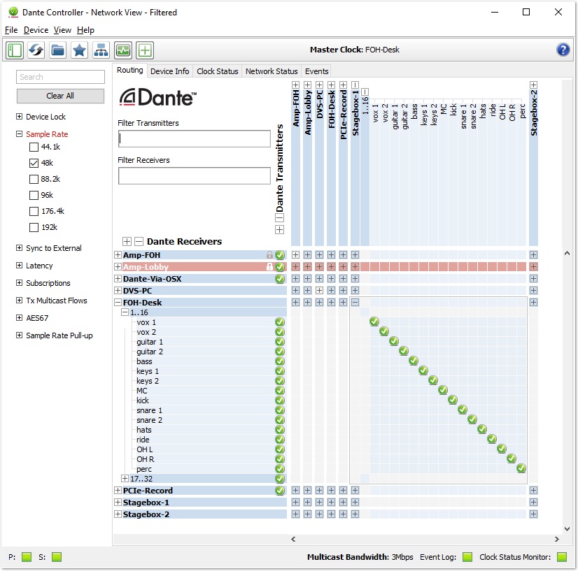網路的健康狀況的即時資訊對於您正確瞭解其性能來說是不可少的。 Audinate 開發了一套功能豐富的 Dante Controller 診斷工具套件,可以全面監測網路的健康狀況 ,包括設備延遲、主動時鐘、資料包錯誤報告和頻寬使用統計資料等。